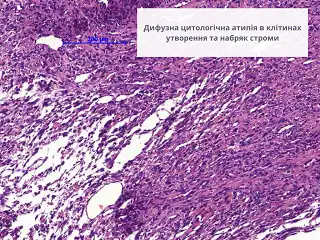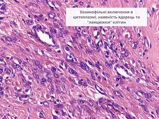 Патологи одразу звернуть увагу на наявність цитологічної атипії в клітинах пухлини, проте, інші важливі ознаки злоякісного новоутворення – мітози або некрози відсутні.