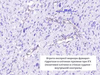 Для з’ясування природи пухлини ми використовуємо імуногістохімічне дослідження – позитивна реакція на гладеньком’язовий актин альфа, десмін та високомолекулярний кальдесмон вказують на походження пухлини з гладеньких міоцитів. Сукупно з втратою експресії фумарат-гідратази всі ці ознаки підводять нас до діагнозу лейоміоми з недостатністю фумарат-гідратази.