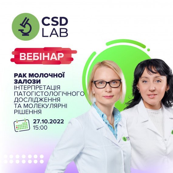 Запрошуємо вас 27 жовтня о 15:00 на вебінар від провідних експертів CSD на тему: “Рак молочної залози. Інтерпретація патогістологічного дослідження та молекулярні рішення. Клінічні випадки”.