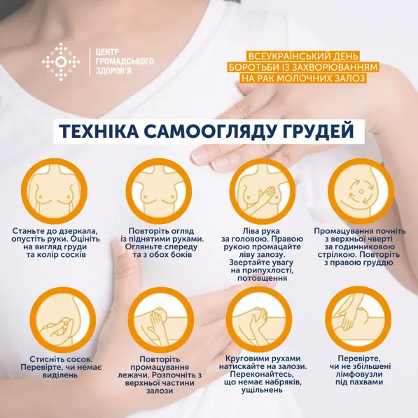 - також усім жінкам, старшим за 20 років, варто щомісяця самостійно обстежувати молочні залози (з 7-го по 14-й день менструального циклу).